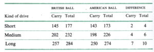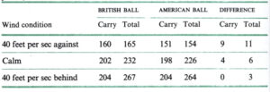 この予想は、実験でも実証されましたが、理論的に予想されるよりも大きな差が見られた。平均240ヤードほどのドライブで、強い横風が吹いたとき、アメリカンサイズのボールはコースから15ヤードほど外れたのに対し、イギリスンサイズのボールは9ヤードほどしか外れなかった。