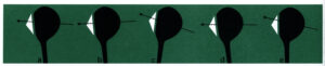 20:5 5個のフックのインパクト。いずれの場合でも、クラブヘッドがスイングされる方向(点線矢印)が、インパクト中のクラブフェースが向いている方向(白い三角形の矢印)よりも右を向いている。