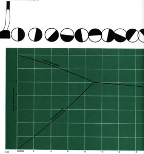 21:2 5フィートのパット行った際のボール速度と回転量を表したもの。ボールは無回転で毎秒7フィートの速度で打ち出される。打ち出し直後はボールと地面の摩擦が大きいため、ボール速度が減少率が大きくなると共にボールが回転する作用を与え続ける。従いボールの全体速度が低下しながら、回転速度が上昇する。ちなみにボールの回転速度5フィートは、毎秒12回転に相当する。やがてボール速度と回転速度が同じになると、ボールは「滑る」ことをやめて、単に「転がる」状態に移行する。(通常は)「滑る」際の摩擦による抵抗よりも、「転がる」際の抵抗の方が少ないため、ボール速度の減少幅も低下する。この実験ではボールの総移動距離はわずかに5フィートに届かなかった。