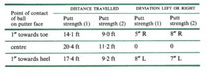 典型的な実験では、まずパッティングマシンを、フェースのセンターで打撃して約20フィート転がるようにセットした。そして次にボール一をヒールより、またはトゥよりに1インチずらして同じ実験をしたところ、距離にして4〜6フィート短くなり、ヒール寄りの場合は左に、またトゥよりの場合は右に、約7インチ逸れることがわかった。