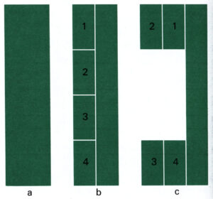 またもう一つの設計上の方法として、クラブヘッドの重量のある程度をヒール側とトゥ側に配置しつつ、ヘッド重心をフェースのセンターに持ってくることができればかなり効果的である。例えば21:5の図のように、重宝家のヘッド(a)を、(b)のように分割し、(c)のカタチになるよう再配分すると、この設計のパターでは両エンドに重量が多く配分されることでミスヒットによるフェースのねじれが低減され、結果飛距離のロスを半分程度まで減らすことができるのだ。(クラブヘッドの受領配分についての全体的な議論は第32章を参照のこと)