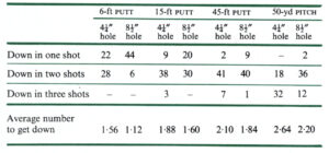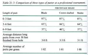 研究チームは、ある特定のタイプのパターを使用しているプレイヤーが、他のパターを使用しているプレイヤーよりも優れた結果を出しているのかを調べるために、多くのテストを実施した。例えば 、シュウェップス P.G.A. 、1965 年 4 月にサンドイッチのプリンシズで開催されたチャンピオンシップでは、すべての競技者のパッティングを、3ラウンドの三つのホールで全て計測した。 パターは、主にブレード、センターシャフト、マレットの 3 種類に分けられる。 ほぼ同数のプロが最初の 2 つのタイプを使用し、わずかに少ないプレイヤーが マレットタイプを使用した。 パター間の比較結果は表 21:3 に表示されている。