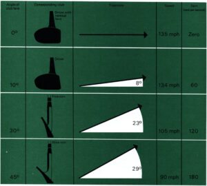 23:5 同じ重量(7オンス)、同じヘッドスピード(時速100マイル)のクラブヘッドで、ロフトだけを変えた際の飛球への影響について。実際には重量7オンスでヘッドスピード時速100マイルでスイングされるのはドライバーだけであるため、ここでの数値は通常のゴルフクラブで打撃した数値とは異なる。