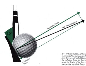 しかし実際にはボールとクラブフェースの間には摩擦が存在するため、その摩擦力はクラブフェースの平行方向にフォースを発生させる。このことはボールに二つの効果をもたらす。一つはボールにスピンを与えること、もう一つはクラブフェースの向きに対して、やや下方に打ち出し角度を下げることである(図23:4)。従い、ボールは常に、クラブヘッドの移動方向と、その際にフェースが向いている方向の間のどこかの仰角で打ち出されることになるが、通常はフェース向きの方にかなり近くなる。
