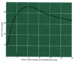 ディンプルの深さを変えていくとどのような影響が出るのかについては、図24:5のグラフにまとめてある。これらの結果は、ダンロップ社がボールにディンプルをスクエアメッシュのマーキングをほどこして実験したものだが、その結果最大キャリーはわずかに理論値を下回る、深さ0.010インチの時に得られることが証明された。