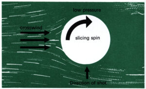 25:2 横風によって飛距離が伸びる原理。ここではスライス回転のかけられたボールが左から右に吹く風にさらされた状態を表している。ボールの前方ではボール表面の大気と横風が同じ方向に動くため、気流が早くなることで低気圧が発生している。またボールの後方ではその逆の現象が起きることで高気圧が発生する。このためボールの前方に向けての揚力が発生することで飛距離が伸びる。実際には揚力、抗力、ヨーモーメントが複雑に関係し合うため、このような単純な力学関係にはならないが、それでもスライス回転がかかっていない状況に比べてこの状況下で飛距離が伸びることは事実である。当然のことだが、ボールは充分に左方向に打ち出されていなければならない。