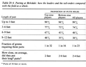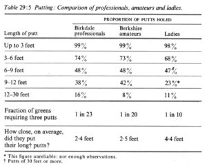 表29 : 5の右端の欄は、ヘイリングゴルフクラブで開催された1966年の英国女子選手権のパッティングの結果をまとめたもので、とりわけロングパットでは、女性は男性に比べてそれほど優れていなかったことを示唆している。