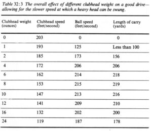 まず、論点を明確にする必要がある。現代のクラブをよく見てみよう。表32:1に典型的なドライバーと典型的な5番アイアンの寸法と重量を示している。