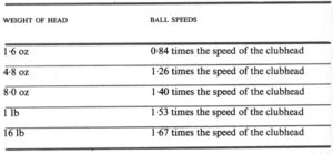 ボールスピードの増加率はクラブヘッドを重くすればするほど小さくなるが、現実的には、当然クラブヘッドが重くなるほど、ヘッドスピードは遅くなる。このことと、ゴルフに関係する人間的な要素(インパクトで体、腕、クラブシャフトが動くので、スイングで発生するエネルギーの一部を吸収することなど)を考慮すると、かなり合理的な仮定として、一般的なのドライバー(長さ43インチ)の最も実用的なヘッド重量は、現代のドライバーに使用されている7オンス程度からかけ離れているとは思えない。