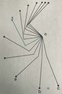 ここで、このピボットにおける二つのレバーに最も大きな真っ直ぐになろうとするフォースがクラブヘッドに働くのは、Xの地点にクラブヘッドが到達する時である。この効果が発生するタイミングによって、クラブヘッドが最高速度に達するタイミングも決定するが、例えば次の10:1Bの図では早すぎるタイミング(aとbの間)でクラブヘッドが最高速度に達してしまい、インパクト付近(bとcの間)では減速に転じてしまっている。
