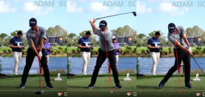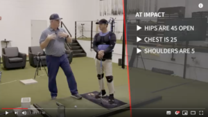 マキロイはインパクトでなんと、「ヒップ(骨盤の左右を結んだ線)は45°、胸郭(肋骨で出来たかごの左右の端を結んだ線)は25°、両肩を結んだ線は5°」目標方向に開いているということです。ここまでの差を作るのはシロウトでは不可能という話にこのあとなるのですが、とにかく両肩を開かずに胸、そしてヒップを開いて角度差を作れているとそれだけパワーが大きく作られていることになりますが、でも肩は開いていないのでプレーンは維持出来てカットになることもないわけです。