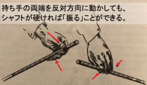 ではここで、「スイング」というアクションが、完全に個別の法則に基づく、特定の動作であることについて考えていきたいと思う。これはレバレッジ、つまりヒッティングのアクションの要素を一切含まず、完全に独立したものである。スイングとレバレッジは、パワーの活用において完全に相反する手法である。スイングにおいては、作用を加える部分とスイングされるものの中間に位置して連結を行っている部分の、両端が常に同じ方向に動いており、レバレッジ(ヒッティング)においては、連結部分の両端が常に異なる方向に動いている。よってこれら二つの方法を同時に行うということは、水と油を混ぜることよりも不可能なのである。