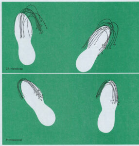 14:2 プロゴルファーのスタンスにおける再現性。アマチュアとプロゴルファーに10球ずつドライバーを打ってもらった際のスタンス位置のトレースである。ハンデ24のプレイヤーのスタンスは、プロのそれと比べてバラバラであることがわかる。よってストロークを開始する前から、このプレイヤーが再現性のあるスイングを行うことを困難にしているのである。