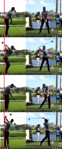 アマとは違い、右のヒップを後ろに引いていくようにテークバックが開始され、次にその右ヒップの位置をキープしたまま、ダウンに向けて左ヒップを後ろに引いていくように動かしています。これを後方から見ると、例えばアドレス時点のヒップ位置にガラスの板を張り付けるようにすると